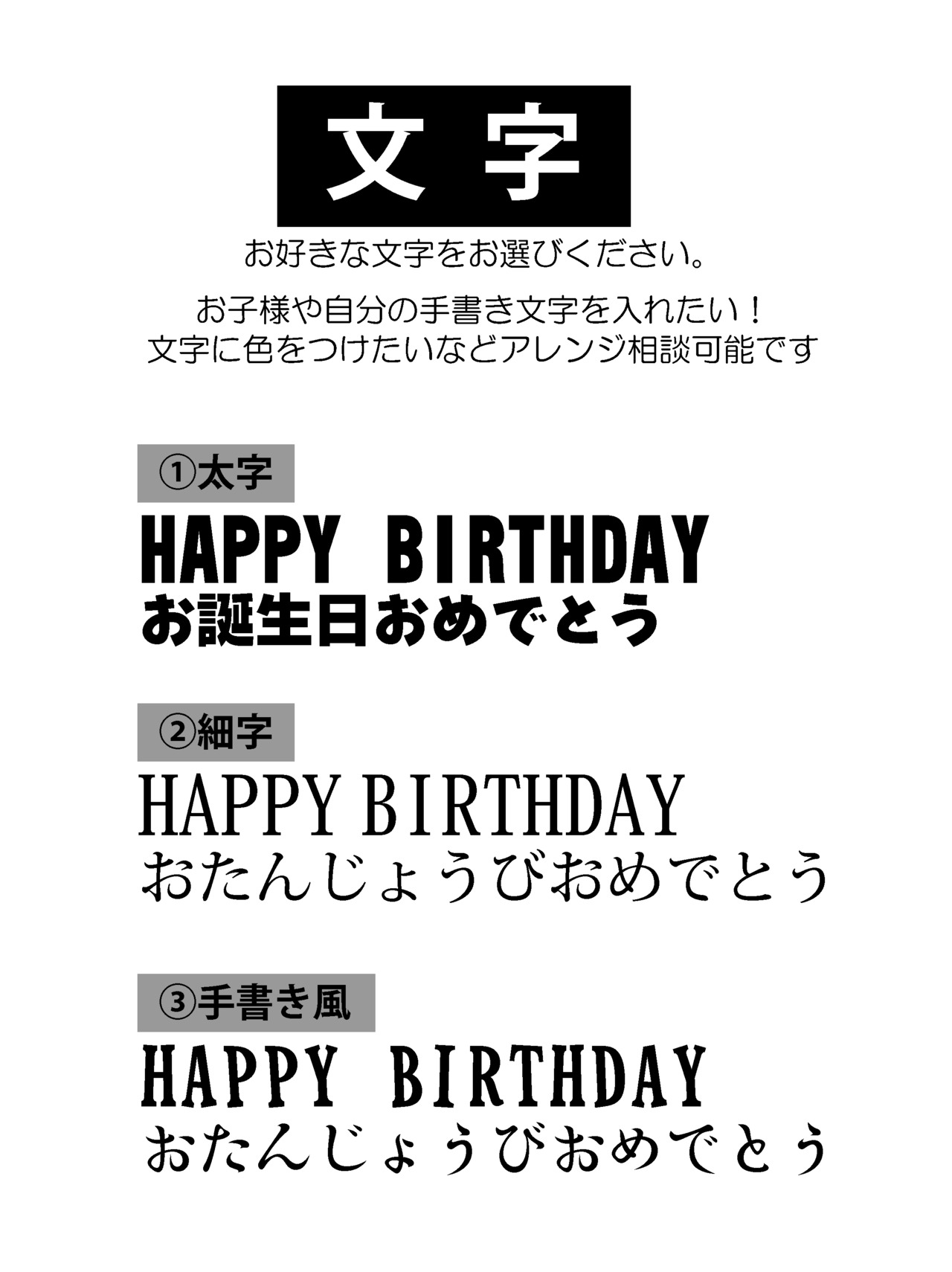 ②文字:3種類(太字・細字・手書き風)からお選びください。